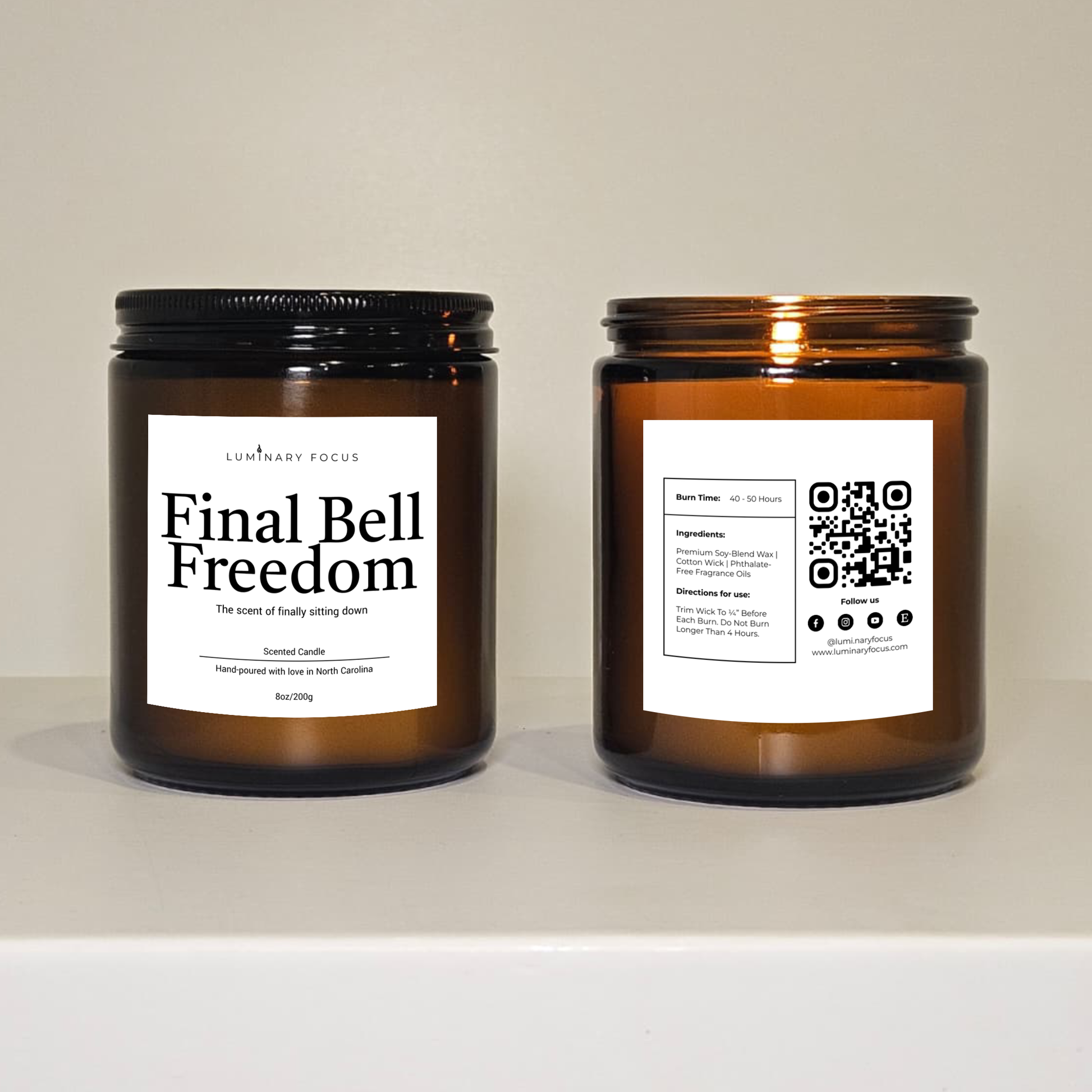 Product Details: Hand-poured into amber glass jars with cotton wicks and premium fragrance oils, available in 8 oz or 4 oz sizes. Each candle arrives in a gift-ready kraft box with an open window, beautifully showcasing the label, and includes a matchbox.