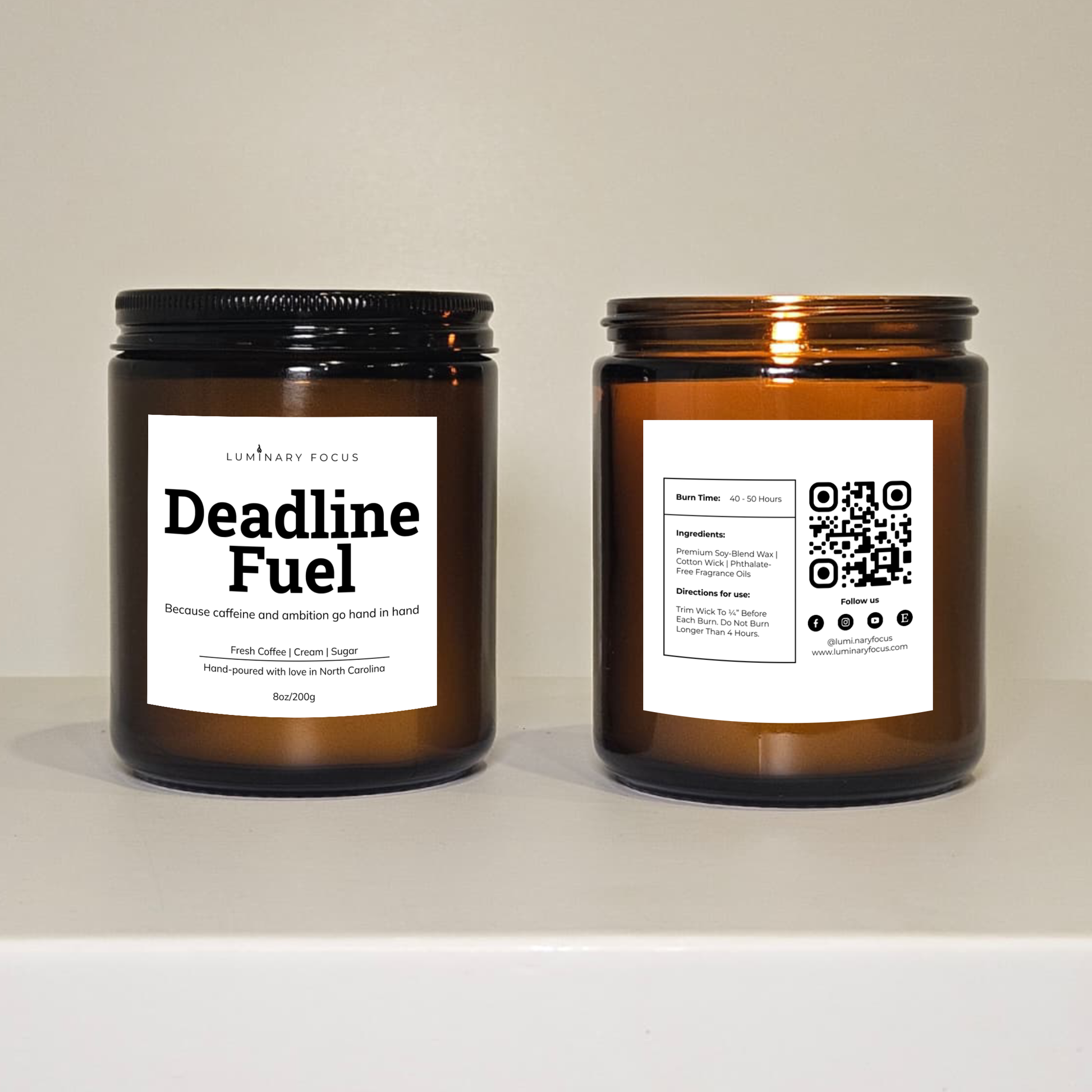Hand-poured into amber glass jars with cotton wicks and premium fragrance oils, available in 8 oz or 4 oz sizes. Each candle arrives in a gift-ready kraft box with an open window, beautifully showcasing the label and includes a matchbox to spark creativity and warmth with every light. Light it up and let the aroma transport you to a zone of pure productivity and intense focus.